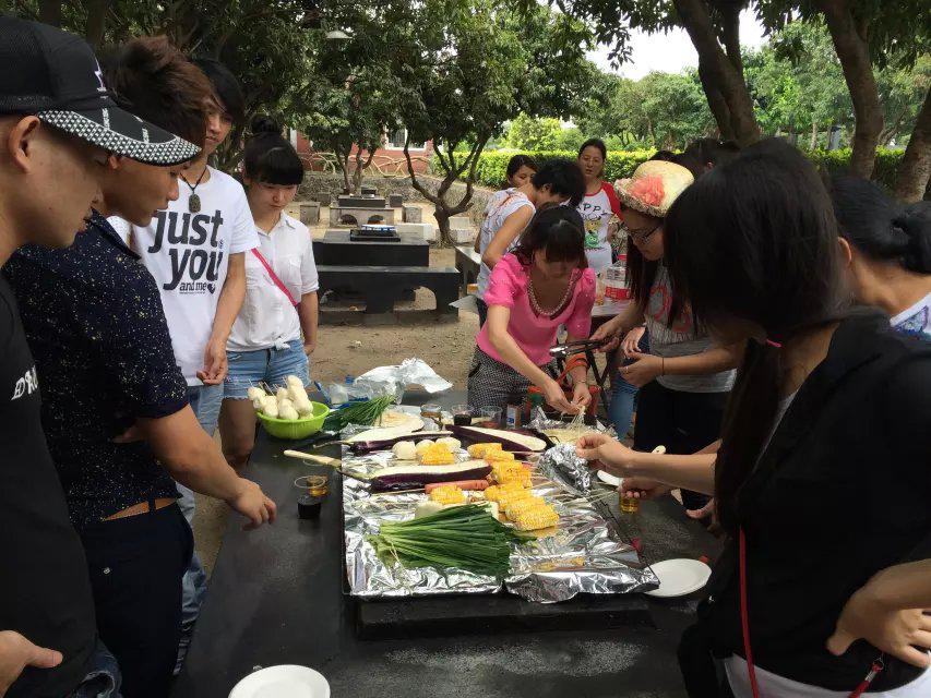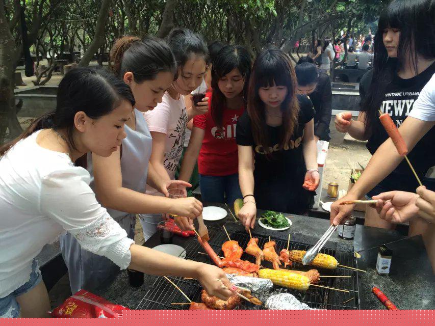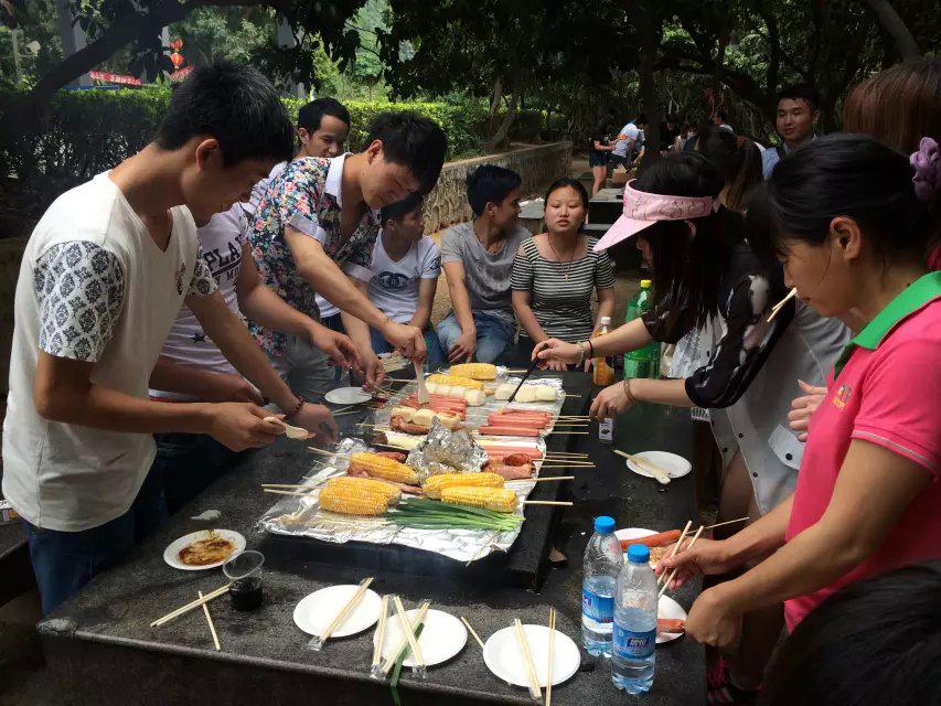 游戏环节之后,大家分工明确,有人洗菜,有人串制食物,配合默契,忙得不亦乐乎!最费劲是要数起炉了,几个人围着炉灶有的扇风,有的吹气,趁着旺盛的炭火,烧烤正式拉开了帷幕。大家展示了不同的烧烤方法和技艺。