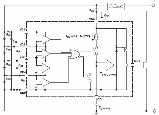 6.根据锂电池锂离子的安全特性,在保护电路中特定加入了锂电二次保护电路,针对常规保护电路失效后,通过二次保护电路检测电池电芯电压,当电池组某一电芯电压高于二次保护电路设定电压时,通过二次保护电路控制串接在电流回路中的温度保护器件动作进行切断电流回路,确保电池组不被充电过压而引起的爆炸或其它安全事故。
