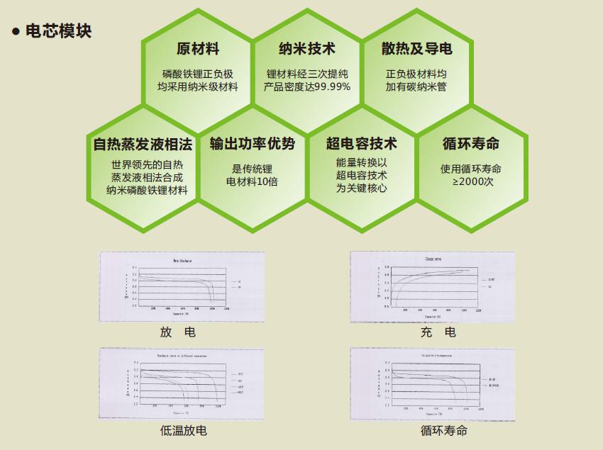 在纯电动汽车领域中的应用。优越性:重量轻、寿命长、智能化、体积小、能量密度高。纳米超电容磷酸铁锂电池组解决方案,是针对磷酸铁锂电池的特性改良的高科技产品。最大的优点就是在汽车加速期间或爬坡时更能表现他的特点,大电流放电电池不会发热,铁锂电池使用陶瓷隔膜,彻底解决了安全隐患。使用寿命是传统铁锂的三到四倍,是目前最尖端的能源解决方案,极佳的动能系统。